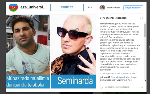 “Əgər bu şəkli hansısa yerdə görsəm, həmin səhifənin admini məndən inciməsin. Onun nəslini, var-yoxunu cərgəyə düzəcəm. hansısa səhifə qoyubsa, mənə direktə atın, xahiş edirəm. Çox səhifədən sildirmişəm. Şəkildə başqa adam olsa, yəni normal insan, adamı yandırmaz, gör məni kimlə yan-yana düzəldiblər”.