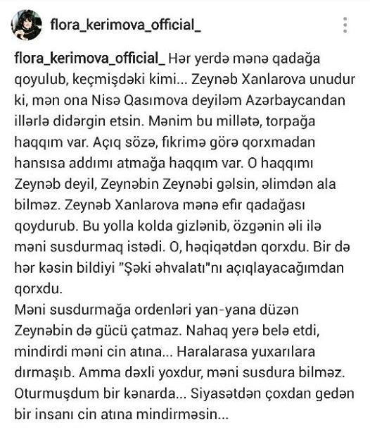 Flora Kərimova Zeynəb Xanlarovanı qorxaq adlandırıb: “Bu yolla kolda gizlənib, özgənin əli ilə məni susdurmaq istədi. O, həqiqətən qorxdu. Bir də hər kəsin bildiyi “Şəki əhvalatı”ını açıqlayacağımdan qorxdu. Nahaq yerə belə etdi, məni cin atına mindirdi. Haralarasa, yuxarılara dırmaşıb. Amma, dəxli yoxdir, məni susdura bilməz. Oturmuşdum bir kənarda, siyasətdən çoxdan gedən bir adamı cin atına mindirməsin”.