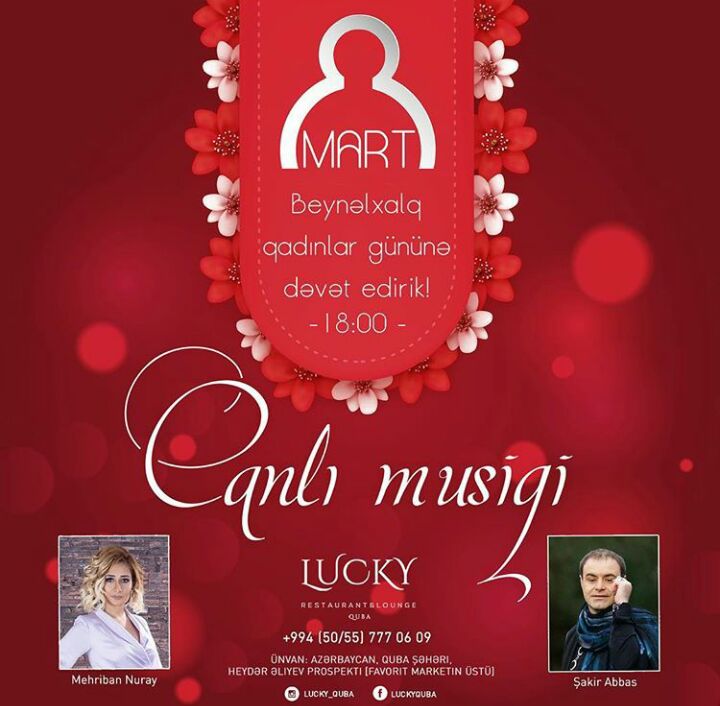 DİA.AZ xəbər verir ki, konsert proqramı "Lucky" restoranında saat 18:00-da baş tutacaq. İfaçılar bayram günündə xanımlara unudulmaz anlar yaşadacaqlar. Əyləncə, coşqu, sürpriz, həyəcan dolu bir gün tamaşaçıları gözləyir.