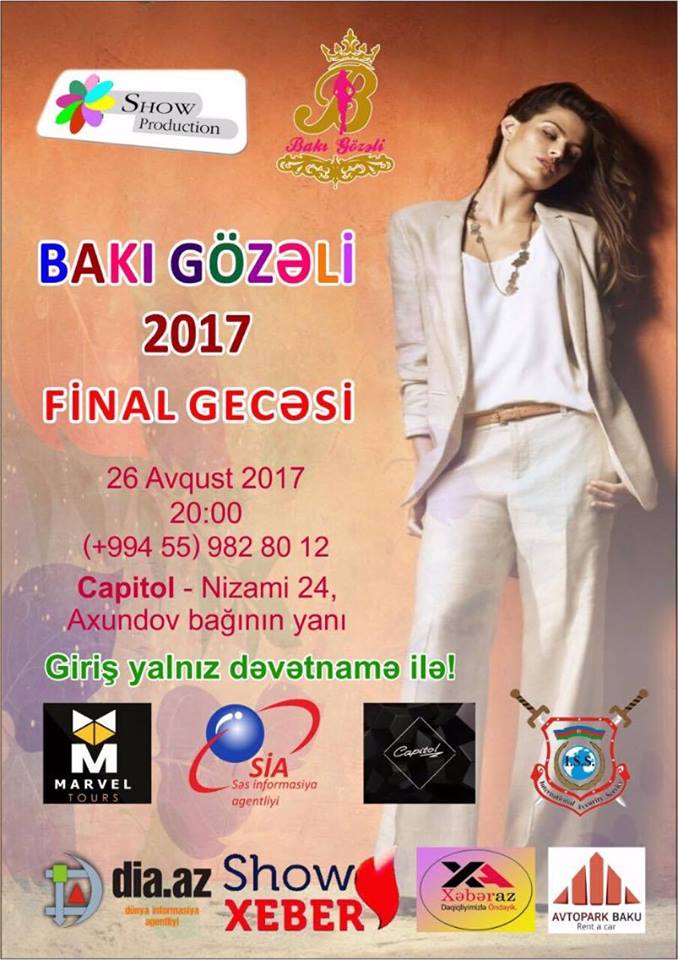 DİA.AZ: - Şou Prodakşn tərəfindən təşkil olunan "Bakı Gözəli-2017" Gözəllik Yarışmasının Final Gecəsi 26 Avqust saat 20:00-da Capitol-da baş tutacaq.