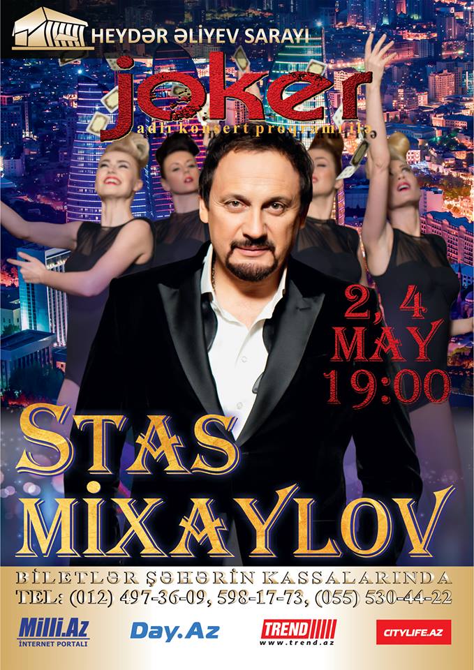 Rusiyada, eləcə də dünyanın müxtəlif ölkələrinin konsert zallarında ən çox tamaşaçı toplayan müğənnilərdən olan Stas Mixaylov may ayının 2-də və 4-də “Joker” adlı yeni solo-konsert proqramı ilə Azərbaycan tamaşaçılarının görüşünə gələcək.