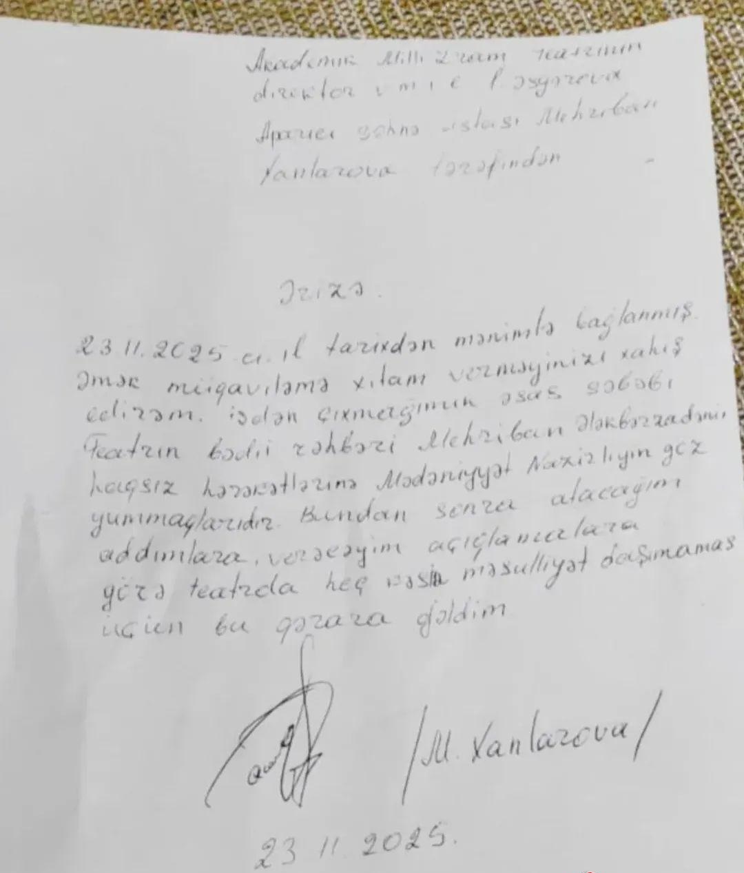 Xeyli müddətdir ki, haqsızlıqla ÜZ-ÜZƏ qalan əməkdar artist Mehriban Xanlarova işdən çıxmaq üçün ərizə yazib.