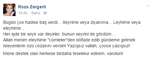 Bütün bu iradlara və haqqında səslənən fikirlərə cavab olaraq, müğənni sosial şəbəkədə post yazıb: “Bu gün çox hadisə baş verdi; xeyrimə və ya ziyanıma, lehimə və əleyhimə... hər işdə bir xeyir var deyirlər, bunun xeyrini də gördüm. Allah mənim əleyhimə “cümlələr”dən istifadə edib gündəmə gəlmək istəyənlərin özü cəzasını versin! Yazıqsınız vallah, çox yazıqsınız!”