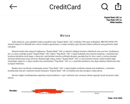 "Deməli, "Kapital Bank"a aid kredit kartı var müddəti bitir deyə yenisini sifariş vermək istədim birbank üzərindən, məndən belə bir ərizəni imzalamağı tələb edir..." "DİA-AZ" xəbər verir ki, bu barədə "Müştəriyəm Şikayətim Var" sosial qrupundakı paylaşımda giley olunur.