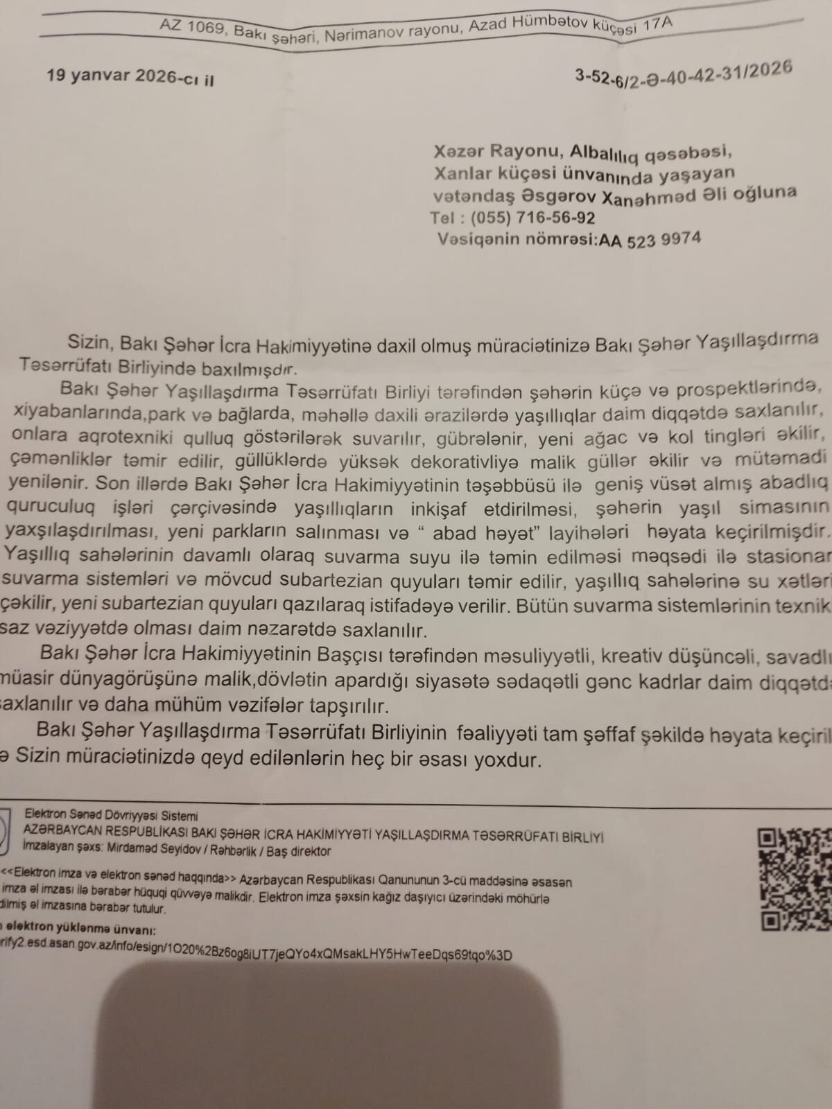Son zamanlar Bakı Şəhər Yaşıllaşdırma Təsərrüfatı Birliyi ilə bağlı mediada çoxsaylı məlumatlar dərc olunur. Qurumun keçmiş əməkdaşı, Azərbaycan Milli Elmlər Akademiyasının Dendrologiya İnstitutunda baş aqronom işləmiş Alim Xanəhməd Əsgərov redaksiyamızla əlaqə saxlayaraq bir çox faktları üzə çıxarıb.