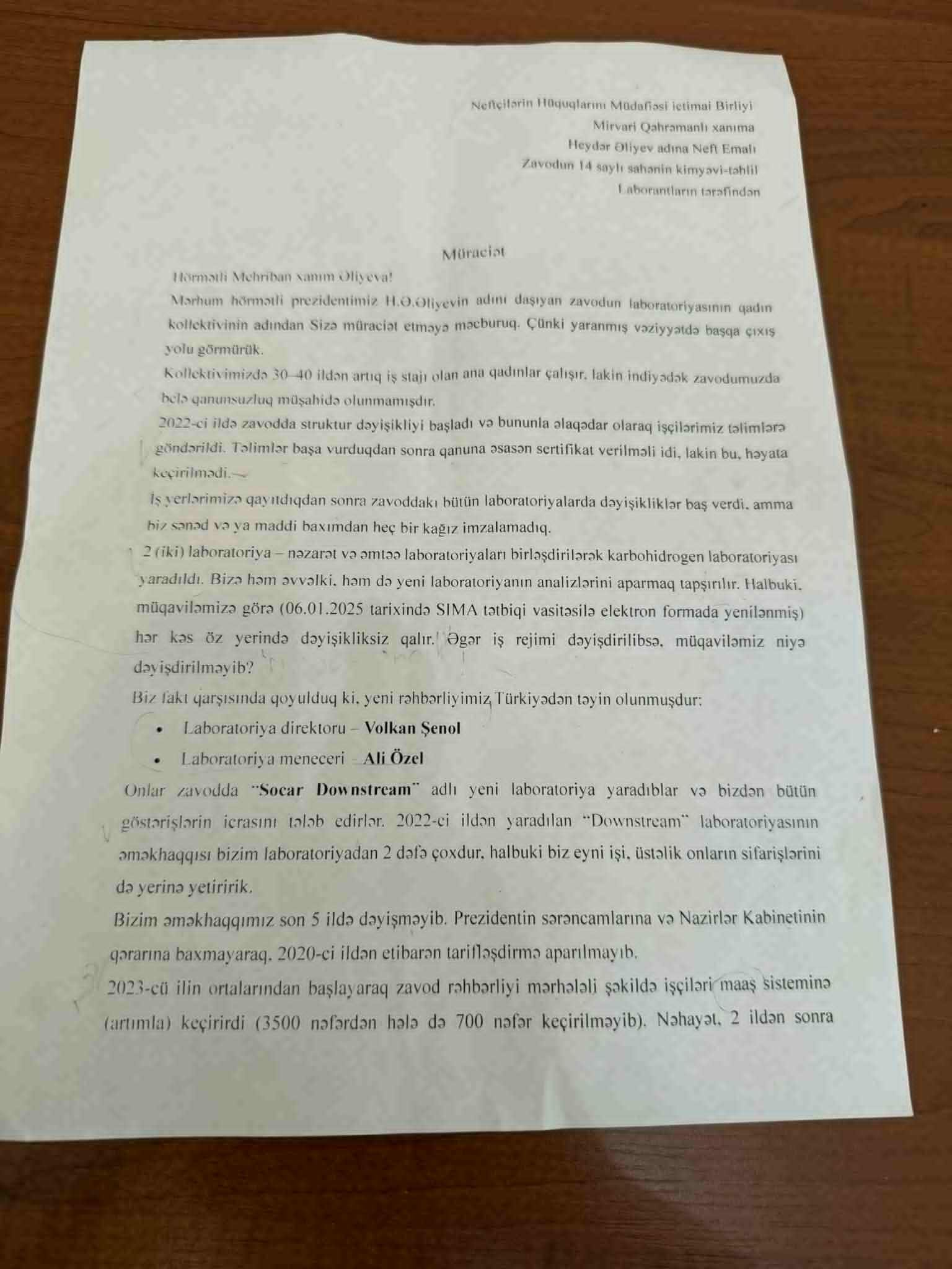 SOCAR Heydər Əliyev adına neftayırma zavodunun 14-cü sahənin kimyəvi-təhlil laborantları , laboraotoriyanın qadın kollektivi adından iş yerlərində yaranmış vəziyyətlə əlaqədar Azərbaycan Respublikasının prezidenti cənab İlham Əliyevə, Azərbaycanın birinci vitse prezidenti Mehriban xanım Əliyevaya Əmək və Əhalinin Sosial Müdafiəsi Nazirliyi yanında Dövlət Əmək Müfəttiçliyi Xidmətinə, İnsan Hüquqlari Müvəkkilə(Ombudsmana) Müraciət ünvanlayıblar. "DİA-AZ" xəbər verir ki, bu paylaşımı öz sosial şəbəkə hesabında təqdim edən Neftçilərin Hüquqlarının Müdafiəsi Təşkilatının (NHMT) sədri, tanınmış hüquq müdafiəçisi Mirvari Qəhrəmanlı eyni zamanda qünunvericiliyə də istinad edərək uyğun önəmli hüquqi izahatı da açıqlayıb. İlk əvbvəl narazı SOCAR əməkdaşının şikayətini təqdim edirik: