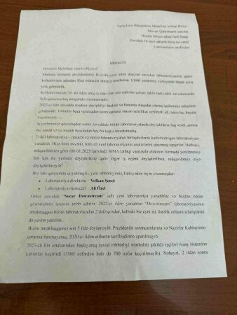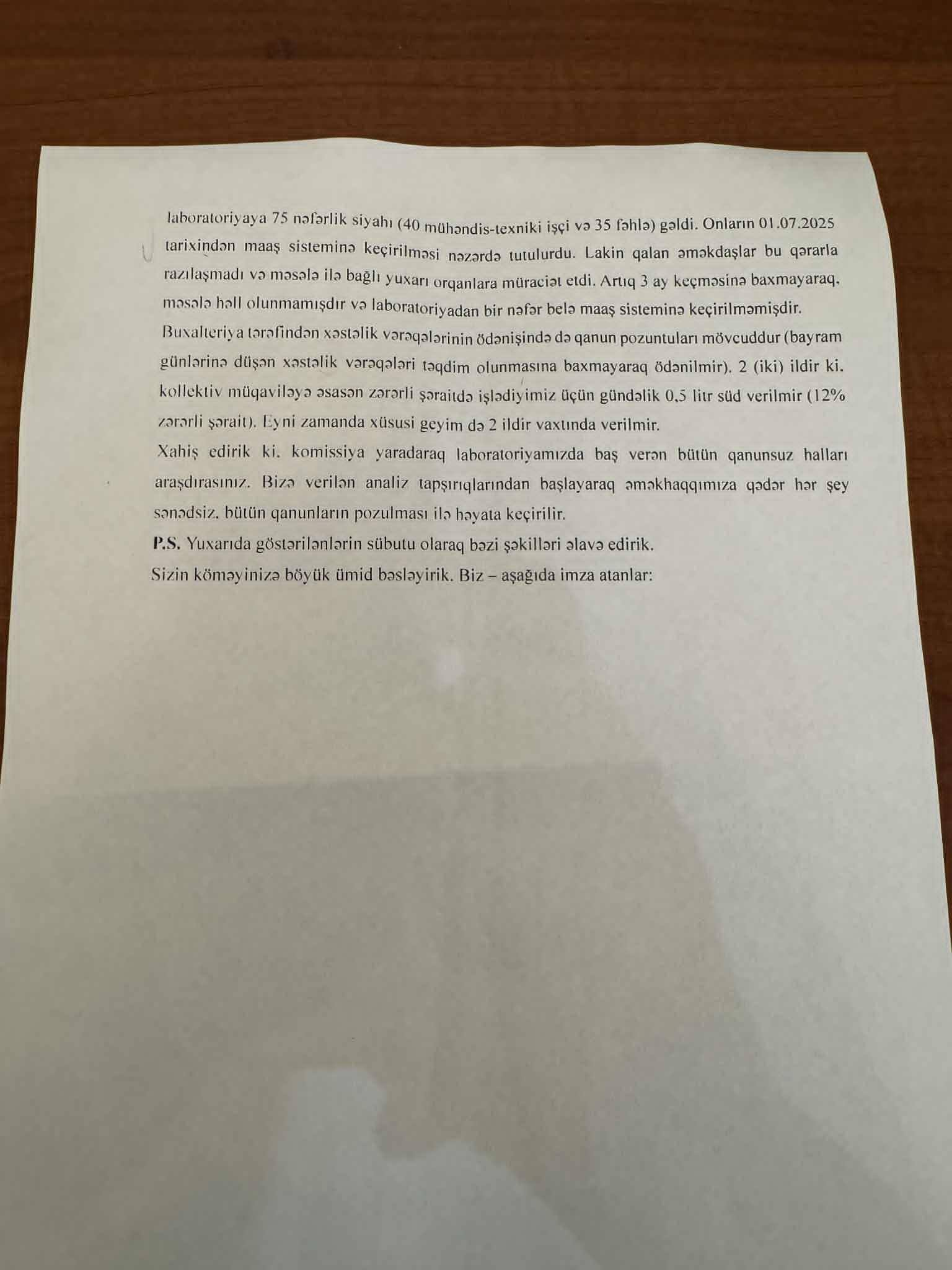 İşçilər müvafiq qurumlardan laboratoriyada baş verən bütün qanunsuz halların araşdırılmasının, (xüsusən sənədləşməni), qeyd olunanlara hüquqi rəy verilməsini xahiş edirlər.