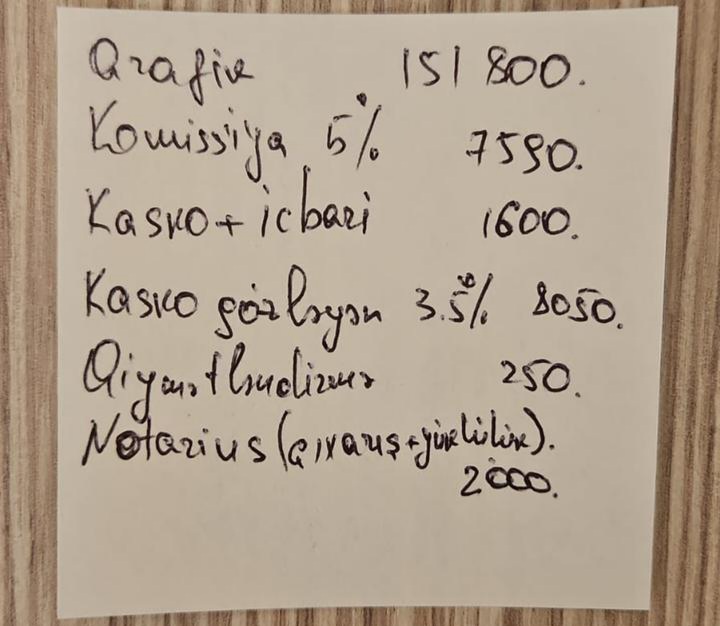 Bəhruz Əliyevə xərclərlə bağlı Vüsal Nəsibov tərəfindən verilən qeyd kağızını təqdim edirik.