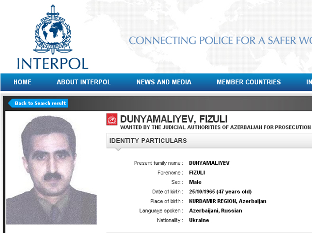 Məlumatda bildirilir ki, 47 yaşlı Fizuli Dünyamalıyev vergidən yayınma cinayətində təqsirli bilinir. İnterpolun saytında həmçinin qeyd olunub ki, F. Dünyamalıyev Azərbaycanın Kürdəmir rayonunda anadan olub, lakin hazırda Ukrayna vətəndaşlığını daşıyır.