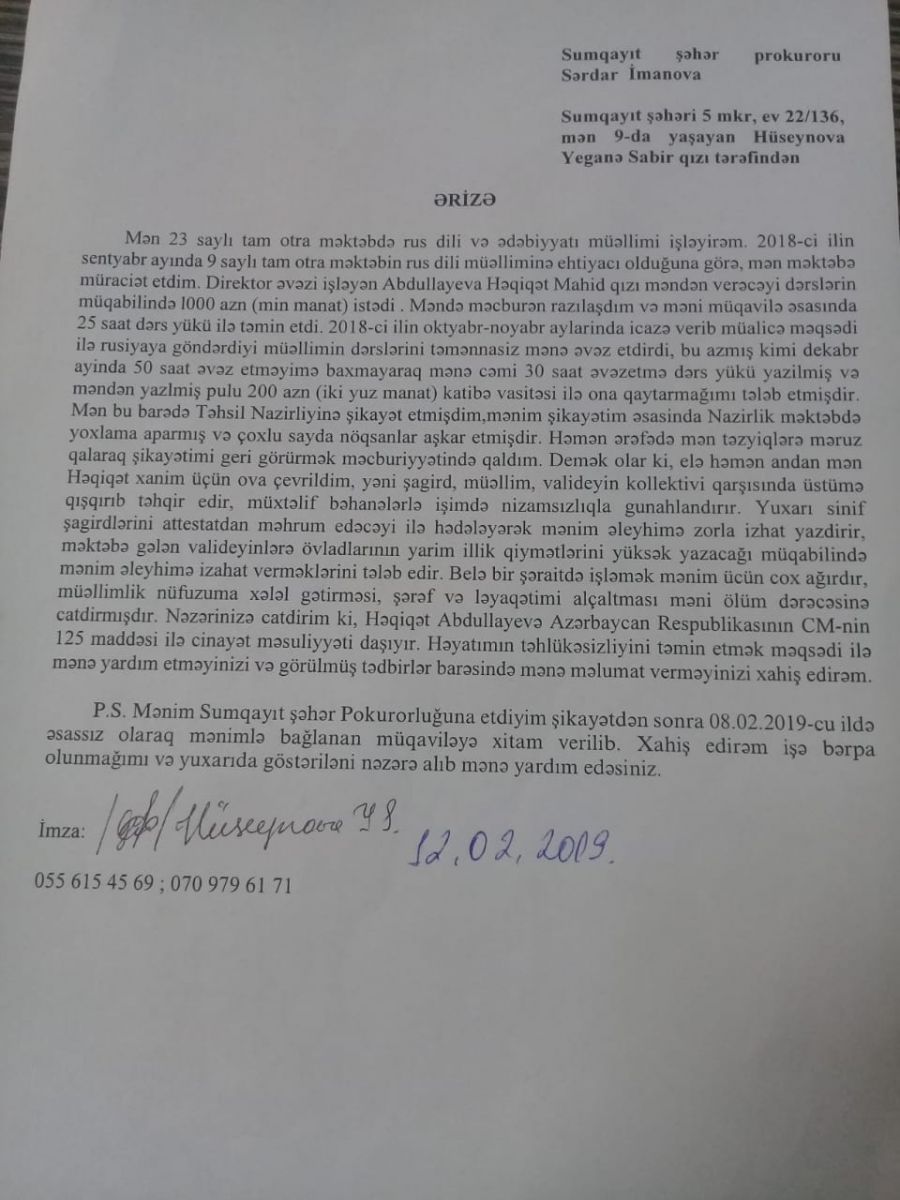 "Direkor əvəzi işləyən Abdullayeva Həqiqət Mahid qızı məndən verəcəyi dərslərin müqabilində 1000 manat istədi. Mən də məcburən razılaşdım və müqavilə əsasında 25 saat dərs yükü ilə təmin olundum. 2018-ci ilin oktyabr-noyabr aylarında icazə verib, müalicə məqsədi ilə Rusiyaya göndərdiyi müəllimin dərslərini təmənnasız mənə əvəz etdirdi. Bu azmış kimi,dekabr ayında əlli saat əvəz etməyimə baxmayaraq, mənə cəmi otuz saat dərs yazıldı. Mənə yazılmış pulu, yəni, 200 manatı katibəsi vasitəsi ilə ona qaytarmağımı tələb etmişdi. Bu barədə Təhsil Nazirliyinə şikayət etmişdim. Şikayətim əsasında nazirlik məktəbdə yoxlama apardı və çoxlu sayda nöqsanlar aşkar etdi. Həmin ərəfədə təzyiqlərə məruz qaldığım üçün şikayətimi geri götürmək məcburiyyətində qaldım. Həmin andan Həqiqət Abdullayeva üçün ova çevrildim. Şagird, müəllim və valideyn kollektivi qarşısında üstümə qışqırıb təhqir edir, müxtəlif bəhanələrlə işimdə intizamsızlıqda günahlandırır. Yuxarı sinif şagirdlərini attestatdan məhrum edəcəyi ilə hədələyərək, mənim əleyhimə zorla izahat yazdırır. Məktəbə gələn valideynlərə övladlarının yarım illik qiymətlərini yüksək yazacağı müqabilində mənim əleyhimə izahat verməkərini tələb edir. Belə şəraitdə işləmək məmin üçün çox ağırdır".