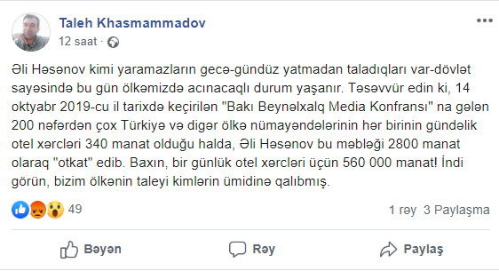 “Əli Həsənov kimi yaramazların gecə-gündüz yatmadan taladıqları var-dövlət sayəsində bu gün ölkəmizdə acınacaqlı durum yaşanır. Təsəvvür edin ki, 14 oktyabr 2019-cu il tarixdə keçirilən “Bakı Beynəlxalq Media Konfransı” na gələn 200 nəfərdən çox Türkiyə və digər ölkə nümayəndələrinin hər birinin gündəlik otel xərcləri 340 manat olduğu halda, Əli Həsənov bu məbləği 2800 manat olaraq “otkat” edib. Baxın, bir günlük otel xərcləri üçün 560 000 manat! İndi görün, bizim ölkənin taleyi kimlərin ümidinə qalıbmış”.