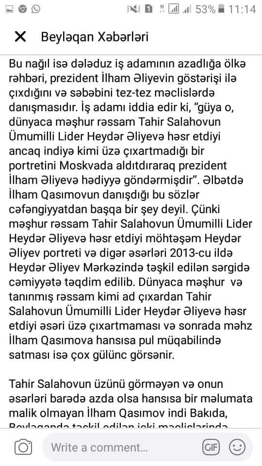 Biz İlham Qasımovun azadlığa çıxmasını arzu edənlərdənik. Ancaq maraqlı bir məqam var ki, dələduzluğa görə 12 il həbs cəzası alaraq 4 il həbs həyatı yaşayan İlham Qasımov azadlığa çıxdıqdan sonra özü haqqında nağıl uydurmağa başlayıb. Bu nağıl isə dələduz iş adamının azadlığa ölkə rəhbəri, prezident İlham Əliyevin göstərişi ilə çıxdığını və səbəbini tez-tez məclislərdə danışmasıdır. İş adamı iddia edir ki, “güya o, dünyaca məşhur rəssam Tahir Salahovun Ümumilli Lider Heydər Əliyevə həsr etdiyi ancaq indiyə kimi üzə çıxartmadığı bir portretini Moskvada aldıtdıraraq prezident İlham Əliyevə hədiyyə göndərmişdir”. Əlbətdə İlham Qasımovun danışdığı bu sözlər cəfəngiyyatdan başqa bir şey deyil. Çünki məşhur rəssam Tahir Salahovun Ümumilli Lider Heydər Əliyevə həsr etdiyi möhtəşəm Heydər Əliyev portreti və digər əsərləri 2013-cu ildə Heydər Əliyev Mərkəzində təşkil edilən sərgidə cəmiyyətə təqdim edilib. Dünyaca məşhur və tanınmış rəssam kimi ad çıxardan Tahir Salahovun Ümumilli Lider Heydər Əliyevə həsr etdiyi əsəri üzə çıxartmaması və sonrada məhz İlham Qasımova hansısa pul müqabilində satması isə çox gülünc görsənir.