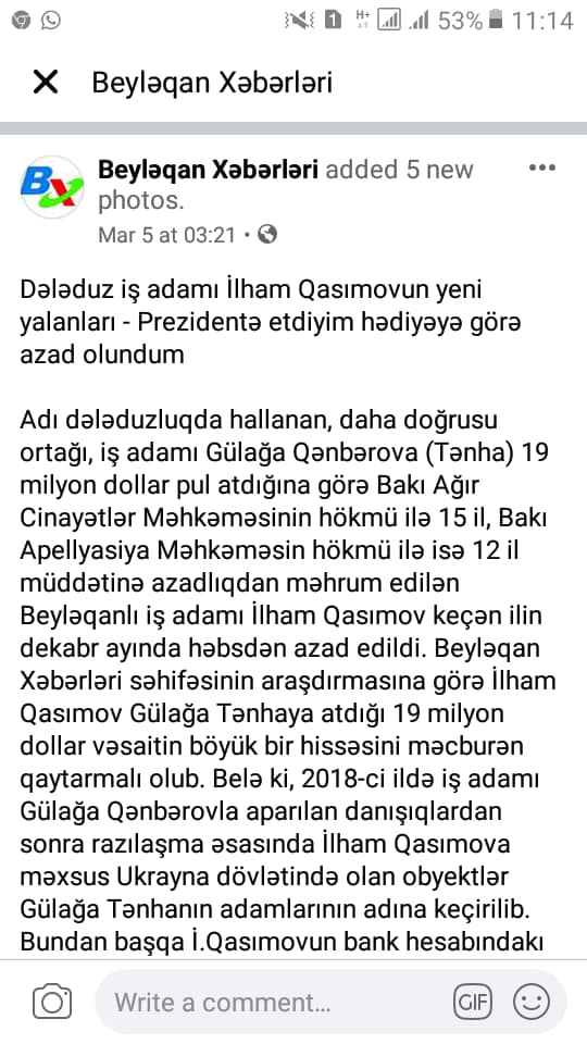 RealMediaaz.space xəbər verir ki, “Beyləqan Xəbərləri” səhifəsinin araşdırmasına görə İlham Qasımov Gülağa Tənhaya atdığı 19 milyon dollar vəsaitin böyük bir hissəsini məcburən qaytarmalı olub. Belə ki, 2018-ci ildə iş adamı Gülağa Qənbərovla aparılan danışıqlardan sonra razılaşma əsasında İlham Qasımova məxsus Ukrayna dövlətində olan obyektlər Gülağa Tənhanın adamlarının adına keçirilib. Bundan başqa İ.Qasımovun bank hesabındakı bir neçə milyon manat vəsaitin çıxarılaraq Gülağa Tənhaya verildiyi deyilir.