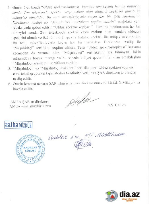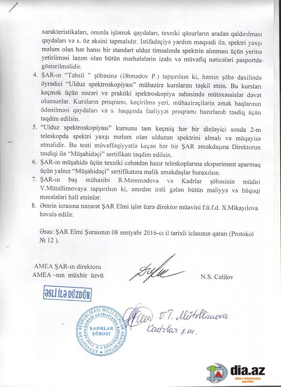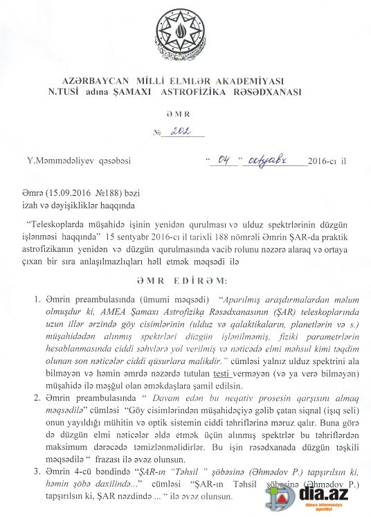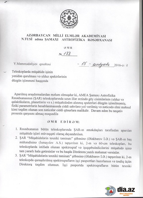 gəlmiş A.Rzayev bu əmrin verildiyi tarixdən sonra ŞAR-ın 2 metrlik teleskopunda guya səhv