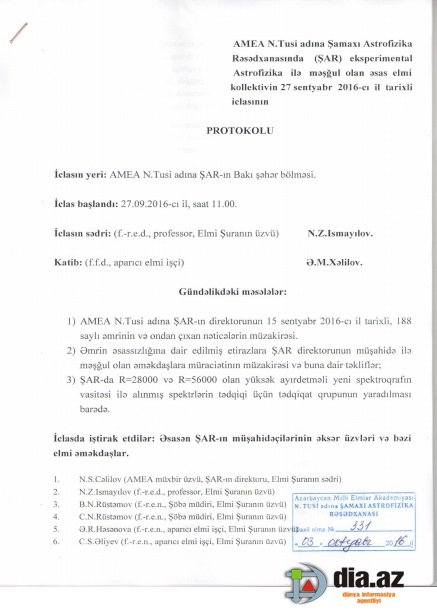 "Biz sizə Şamaxı Astrofizika Rəsədxanasının direktoru Namiq Cəlilovun biabırçı qərarlarını (в„–188 РѕС‚ 15.09.2016 Рё в„–202 РѕС‚ 04.10.2016) və 27.09.2016-cı il tarixli etiraz toplantısının protokolunu göndəririk.