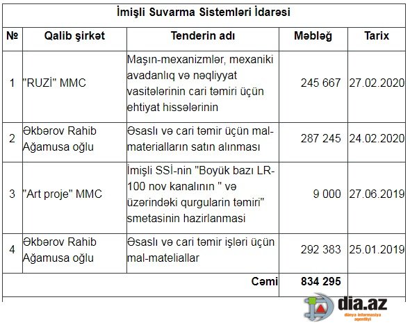 2019-2020-ci illərdə ən böyük məbləğli tenderləri "RUZİ" MMC və sahibkar Rahib Əkbərov qazanıb. Əkbərov Rahib ümumi məbləği 579 min 628 manat olan 2, “RUZİ” MMC 245 min 667 manatlıq 1 tenderin qalibi olub.