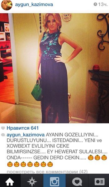 “Ayanın gözəlliyini, dürüstlüyünü, istedadını, yeni və xoşbəxt evliliyini çəkə bilmirsinizsə, ey həşərat sülaləsi, gedin, dərd çəkin. Bəli, bütün subaylara qismət olsun. Sevir, sevilir, çox xoşbəxtdir. Tezliklə də ana olacaq. İnşaallah, sağ-salamat…”