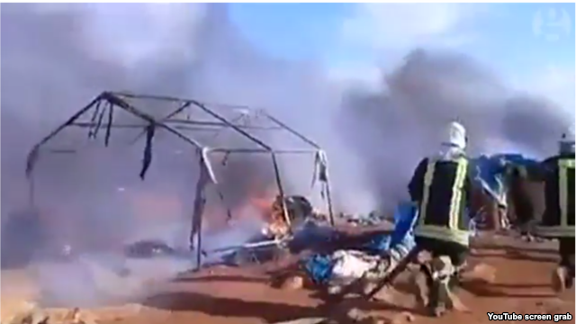 Hava zərbəsindən sonra düşərgədə yanğın başlanıb. Facebook sosial şəbəkəsində yerləşdirilmiş fotolarda onlarla çadırın alovlandığı görünür.