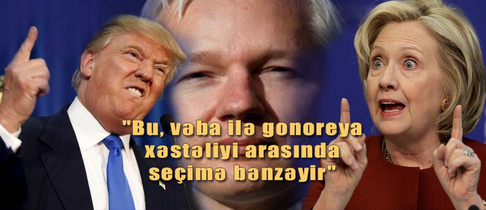 WikiLeaks saytının əsasını qoyan Culian Assanj ABŞ-da prezidentlik üçün səsverməni vəba və gonoreya (cinsi yolla keçən xəstəlik) arasında seçimlə müqayisə edib. FaktXeber.com-un məlumatına görə, bu barədə o, müstəqil Democracy Now! Telekanalına müsahibəsində deyib. В«Siz məndən soruşursunuz ki, vəbanı istəyirsən, yoxsma gonoreyanı? Şəxsən mənə bunların heç bir xoş gəlmirВ», - deyə o, bildirib. В«Fikrimcə siz ABŞ siyasətinin necə işlədiyindən xəbərniz var. Kim və hansı partiya olmasından asılı olmayaraq, hakimiyyətə gəldikdən sonra sürətlə bürokratiyaya qarışır. Bu səbəbdən kimin qnalbil olacağı elə də önəm daşımırВ». Xatırladaq ki, noyabrın 8-də ABŞ-da ümumxalq seçkilər keçiriləcək.