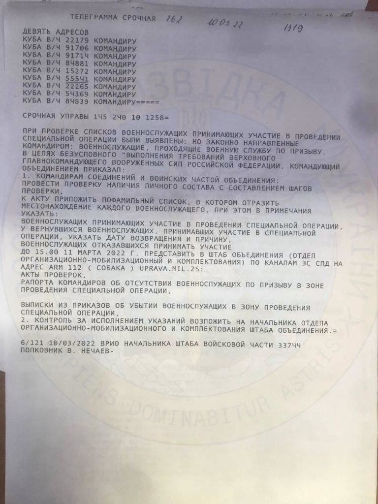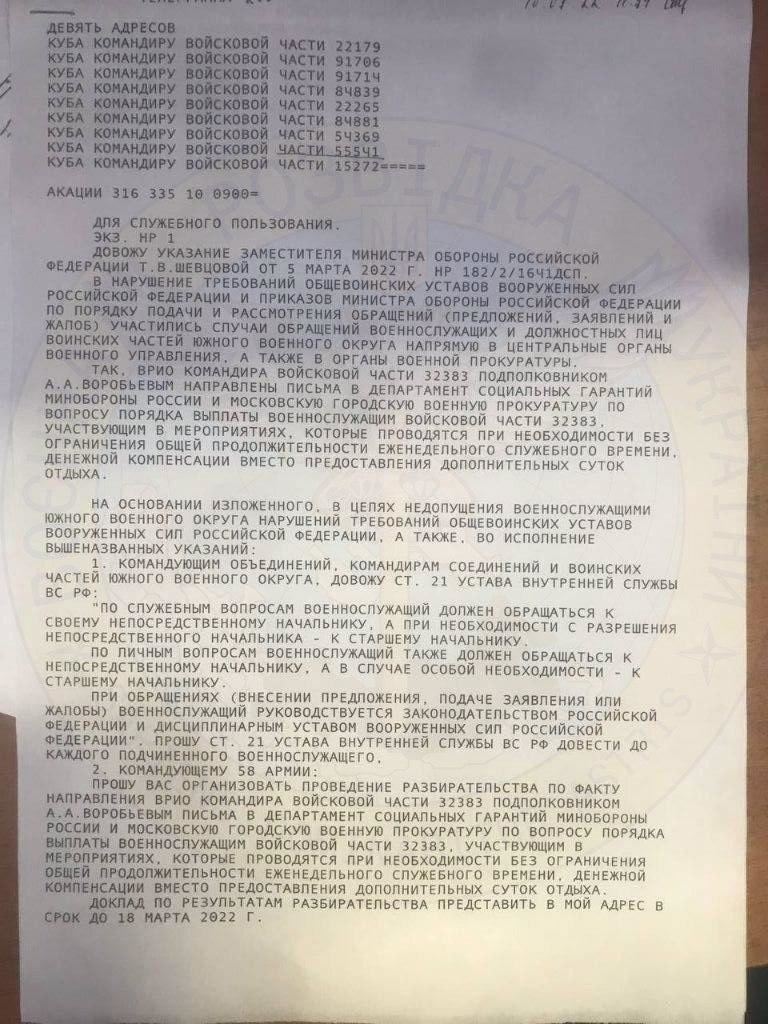 Ukrayna kəşfiyyatı Rusiya ordusunun daxili sənədlərini əldə edib. diaaz.space yeniavaz.com-a istinadla xəbər verir ki, sənədləri Ukrayna Müdafiə Nazirliyinin Baş Kəşfiyyat İdarəsi yayıb. Sənədlərdə rus hərbçilərin Ukraynaya müdaxilə üçün vəd edilmiş maddi ödənişləri almadığı göstərilir. Qeyd olunur ki, onlara pul əvəzinə əlavə istirahət günləri də təklif olunur, maliyyə çatışmazlığından şikayət etmək isə qadağandır: "Rusiya hərbçilərinin onlara vəd edilən nağd ödənişləri almadığını təsdiq edən sənədlər daxil olub. Doqquz hərbi hissənin komandirlərinə ünvanlanan teleqramda Rusiya hərbçilərinin mərkəzi hərbi hakimiyyət orqanlarına müraciətindən hiddət ifadə olunur. Sənədlərdən belə başa düşülür ki, işğalçıların nağd ödənişləri məhdudlaşır, əvəzində onlara əlavə istirahət günləri təqdim edəcəklərini vəd edirlər. Eyni zamanda, maliyyə çatışmazlığından şikayət etmək və hətta bu cür cəhdlər üçün icraat təyin etmək qadağandır". Qeyd olunur ki, sənədlərdən həmçinin, Ukraynaya qanunsuz çağırışçıların göndərilməsi də əks olunub.