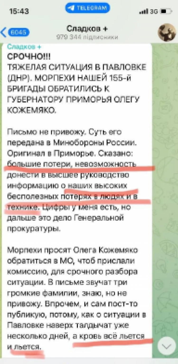 Bildirilir ki, özünü “hərbi komissar” hesab edən rus təbliğatçısı Aleksandr Sladkov gözlənilmədən böyük itkilər verdiklərini elan edib. Onun sözlərinə görə, Pavlovkada vəziyyət “çətindir”. Qeyd edib ki, 155-ci briqadanın dəniz piyadaları Primorye qubernatoru Oleq Şkoremyaka məktub yazıblar.