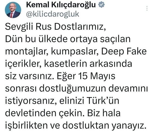 Çox adam elə düşünür ki, Kemal Kılıçdaroğlu hakimiyyətə gəlsə, Türkiyə-Rusiya münasibətləri qırılma nöqtəsinə qədər gərginləşəcək. Elə bir şey yoxdur, Türkiyə bu regionda Rusiya ilə əməkdaşlıqdan qaçmağı məqbul hesab etmir. İki ölkəni birləşdirən müştərək maraqlar var, hər iki dövlət öz siyasətlərini tarixi təcrübələrdən dərs çıxararaq formalaşdırıb və irəliyə aparıb. Bu öz yerində, Kılıçdaroğlunun Muharrem İncenin prezidentliyə namizədlikdən geri çəkilməsindən sonra Rusiyanı ittiham etməsi isə məntiqi fikir doğurur. 1. Əgər Kılıçdaroğlunun dediyi kimi, şantaj videolarının arxasında Rusiya dayanırsa, o zaman diqqət AKP-yə yönəlir. Yəni, AKP iqtidarının Rusiya ilə əlaqələrdə yüksək səviyyəli əməkdaşlığa üstünlük verməsi Moskvanı gözündə Ankaranın çəkisini qaldırır. Əgər Kılıçdaroğlu düz danışırsa (?) onda İnceyə qarşı kampaniyanın təlimatçısının kim olduğu görünür. Buradan məntiqi bir sonluq çıxır: İncenin geri çəkilməsi Rəcəb Tayyib Ərdoğanın seçki mənafeyinə uyğundur. 2. Kılıçdaroğlu düz danışmırsa, o zaman Rusiya amilini ortaya atmaqla CHP-nin kumpas qurmaqdakı əməlini ört-basdır etməyə və Qərbdən daha güclü dəstək almağa çalışır. Yaxşı, Rusiya amilini kənara qoyaq, İncenin geri çəkilməsi əsas rəqiblərdən kimin xeyrinə yarayır? Hesab edirəm ki, Ərdoğan bir qədər yumşaq və soyuqqanlı tövr sərgilədi, məncə, bu, onun seçki texnologiyasının bir komponenti idi... Aqşin Kərimov - DİA.AZ