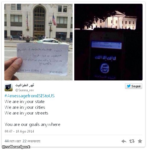 ANS PRESS-in məlumatına görə, İslam Dövləti (İŞİD) terror qruplaşması İraqda ABŞ ordusunun hava hücumlarına məruz qadığı bir vaxtda, Ağ Ev rəsmilərini qorxutmaq üçün sosial şəbəkədə çəkdikləri fotoşəkli paylaşıblar. Belə ki, İŞİD üzvlərindən biri Ağ Evin qarşısındakı Pensilvaniya prospektində dayanaraq, arxa fonda Ağ Ev olmaqla İŞİD bayrağının şəklini çəkib və “Twitter” hesabında paylaşıb.