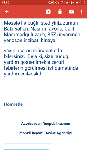 Şikayətçinin sözlərinə görə başına gətirilənlərdən sonra Mənzil İnşaatı Dövlət Agentliyinə rəsmən müraciət edib. MİDA-dan ona bildirilib ki, qurumun Könül Kərimova adlı əməkdaşı yoxdur və istənilən məsələdə ona hüquqi yardım göstərməyə hazırdırlar.