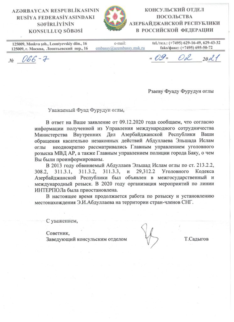 Azərbaycan DİN-in Baş Cinayət-Axtarış İdarəsi Arzu Daşdəmirov tərəfindən verilən cavabdan belə görünür ki, İnterpolun Baş Katibliyinin 23.01.2020-ci il tarixli qərarı ilə təşkilatın Nizamnaməsinin 2 (1), 3-cü bəndinə əsasən Elşad Abdullayevin beynəlxalq axtarışına xitam verilmişdir.
