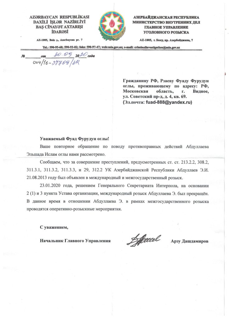 Mən öz tərəfimdən qətiyyətlə xahiş edirəm ki, ədalət mühakiməsindən gizlənən cinayətkar Abdullayev Elşad İslam oğlu barəsində İnterpol xətti ilə beynəlxalq axtarışın yenidən başlanması üçün müvafiq tədbirlər görəsiniz.