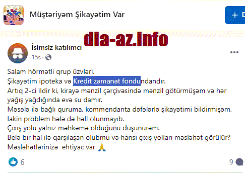 "Şikayətim ipoteka və Kredit zəmanət fondundandır". diaaz.space bildirir ki, bu barədə "Müştəriyəm Şikayətim Var" sosial qrupundakı paylaşımda giley olunur.