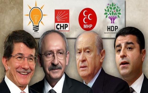 Ədalət və İnkişaf Partiyası (AKP) 40.9% Cumhuriyyət Xalq Partiyası (CHP) 25.0% Milliyətçi Hərəkat Partiyası (MHP) 16.3% Xalqların Demokratik Partiyası (HDP) 13.1% Səadət Paartiyası 2.1%