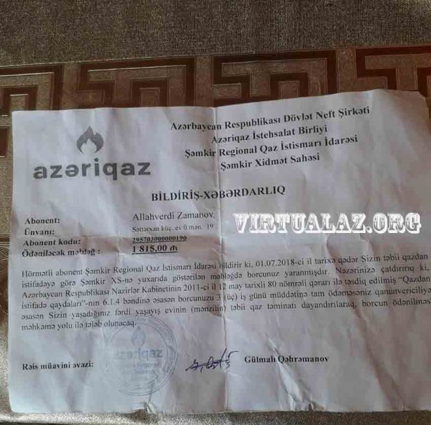“Səhər yuxudan ayıldıq ki, bizə bu ilin iyul ayının 1-dək olan qaz sərfinə görə 1815 manat borc gəlib. Bunun 200 manatı əvvəlcədən var idi və avqustun sonuna qədər ödəyəcəyik. Əlavə 1600 manatı görəndə şok keçirdik və hələ də özümüzə gələ bilmirik...”, - deyə şikayətçi bildirir.