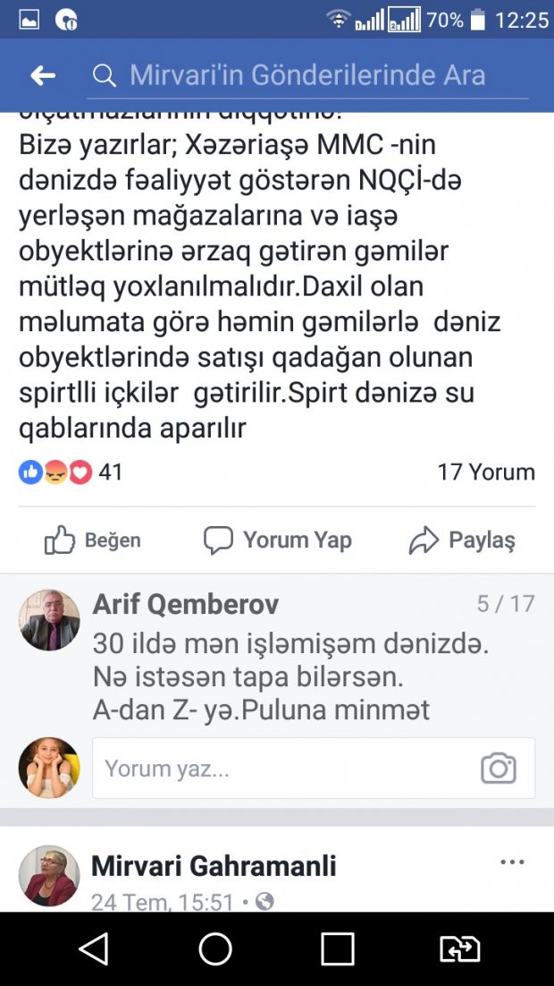 Qəhrəmanlı daha sonra “Xəzər İaşə”yə məxsus yeməkxanadan fotogörüntü paylaşaraq masanın üstündəki xan arağına diqqət çəkir: “Neftçi dili ilə desək “zavodskoy araq” dənizə hansı vasitələrlə gətirilir? Deyəsən, stolun üstündə balıq da var.Təsadüfən o balıqçı qayıqlarının tutduğu balıq deyil, Xəzər İaşə?”