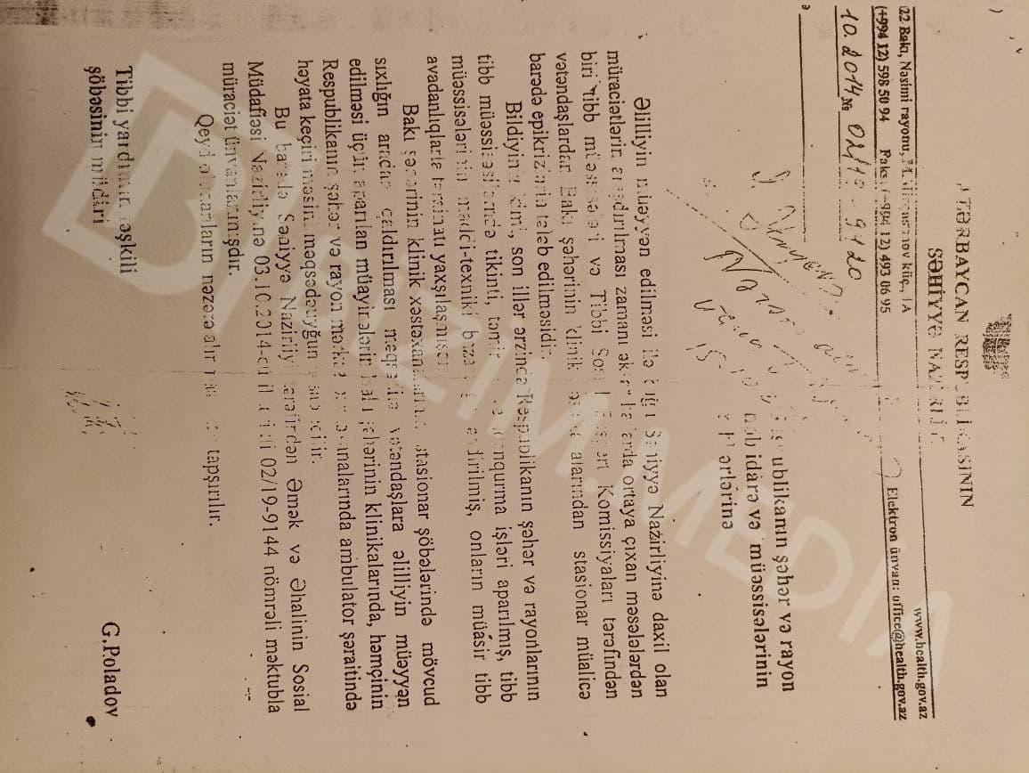 Şikayətçi M.Topçubaşov adına xəstəxanadan ona arayış verilərək, onu Səhiyyə Nazirliyinə yolladığını da bildirib: