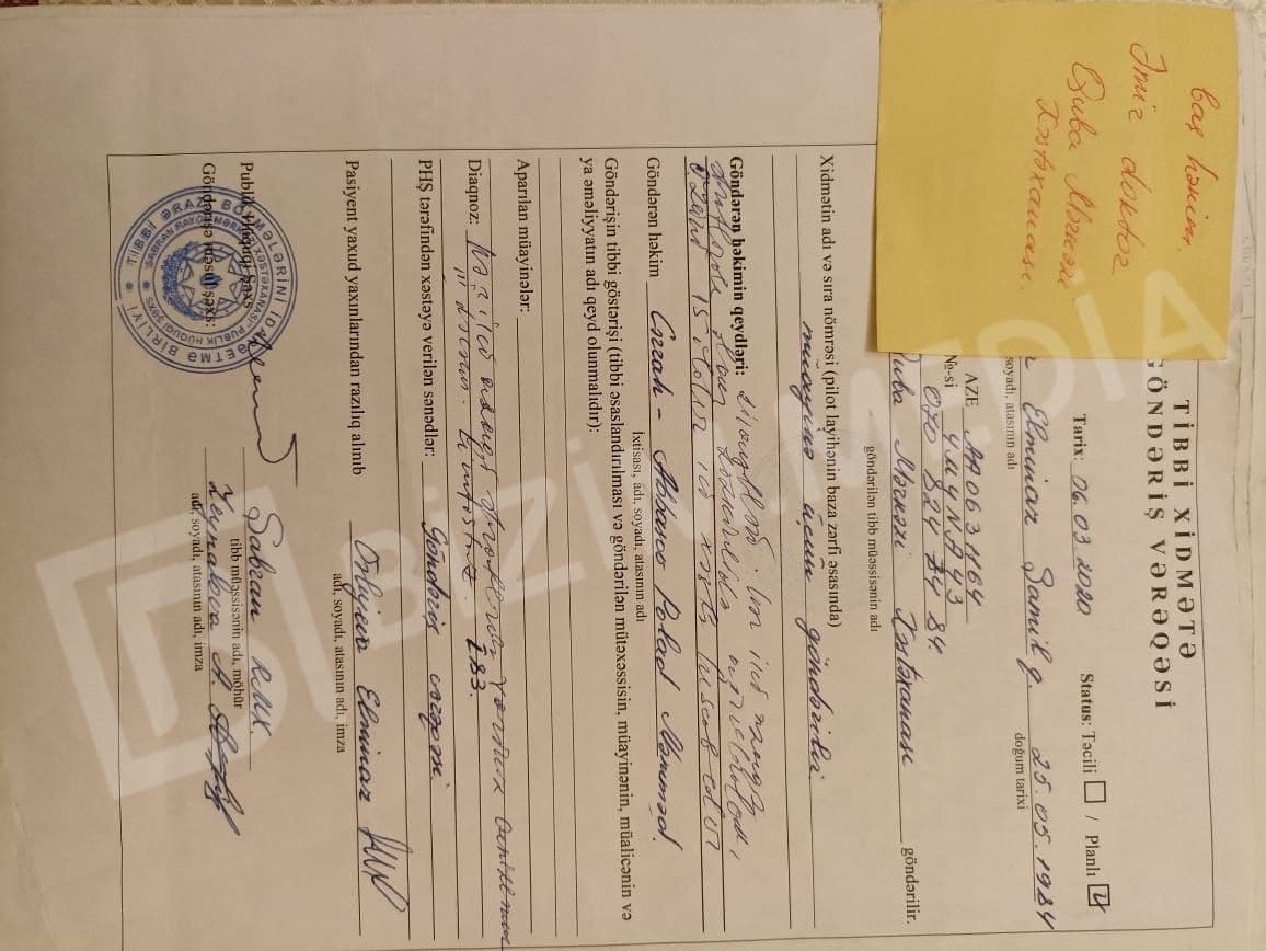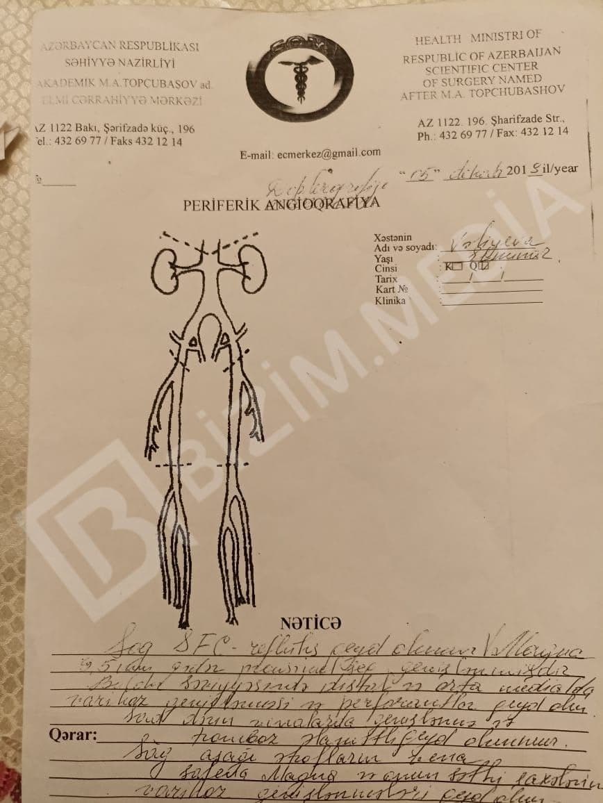 Həmin bu müalicə də Şabran xəstəxanasında olmadığı üçün, xəstə Bakıya M. Topçubaşov adına Elmi Cərrahiyyə Mərkəzinə göndərilib.
