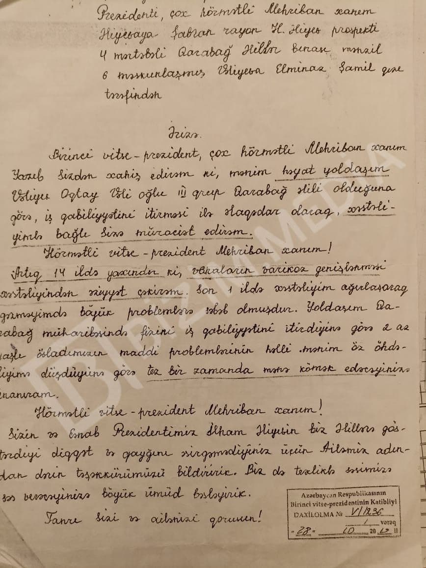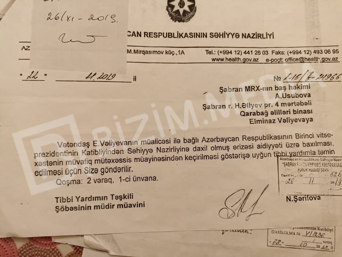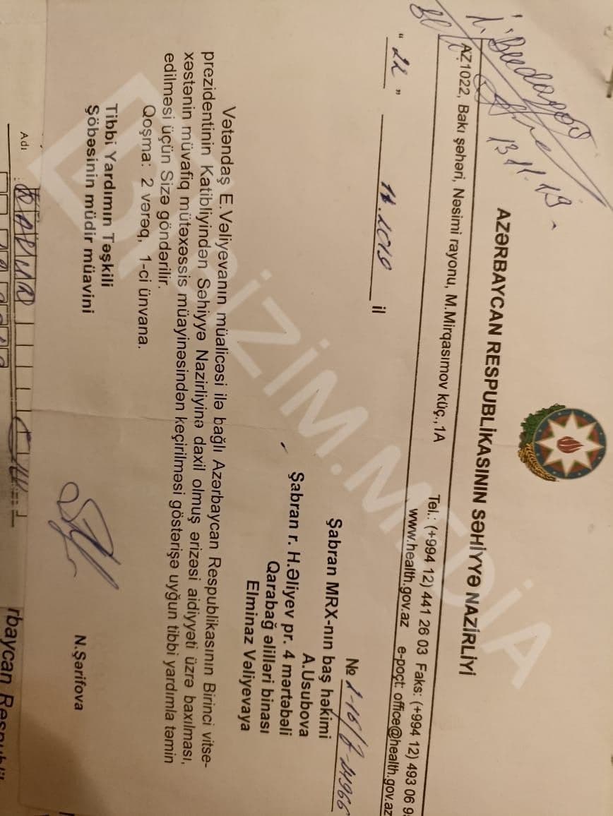 E.Vəliyeva həmçinin qeyd edib ki, məktubuna təsdiq cavabı gəldikdən sonra Şabran xəstəxanasından onu müayinə üçün M. Topçubaşov adına Elmi Cərrahiyyə Mərkəzinə yollayıblar.