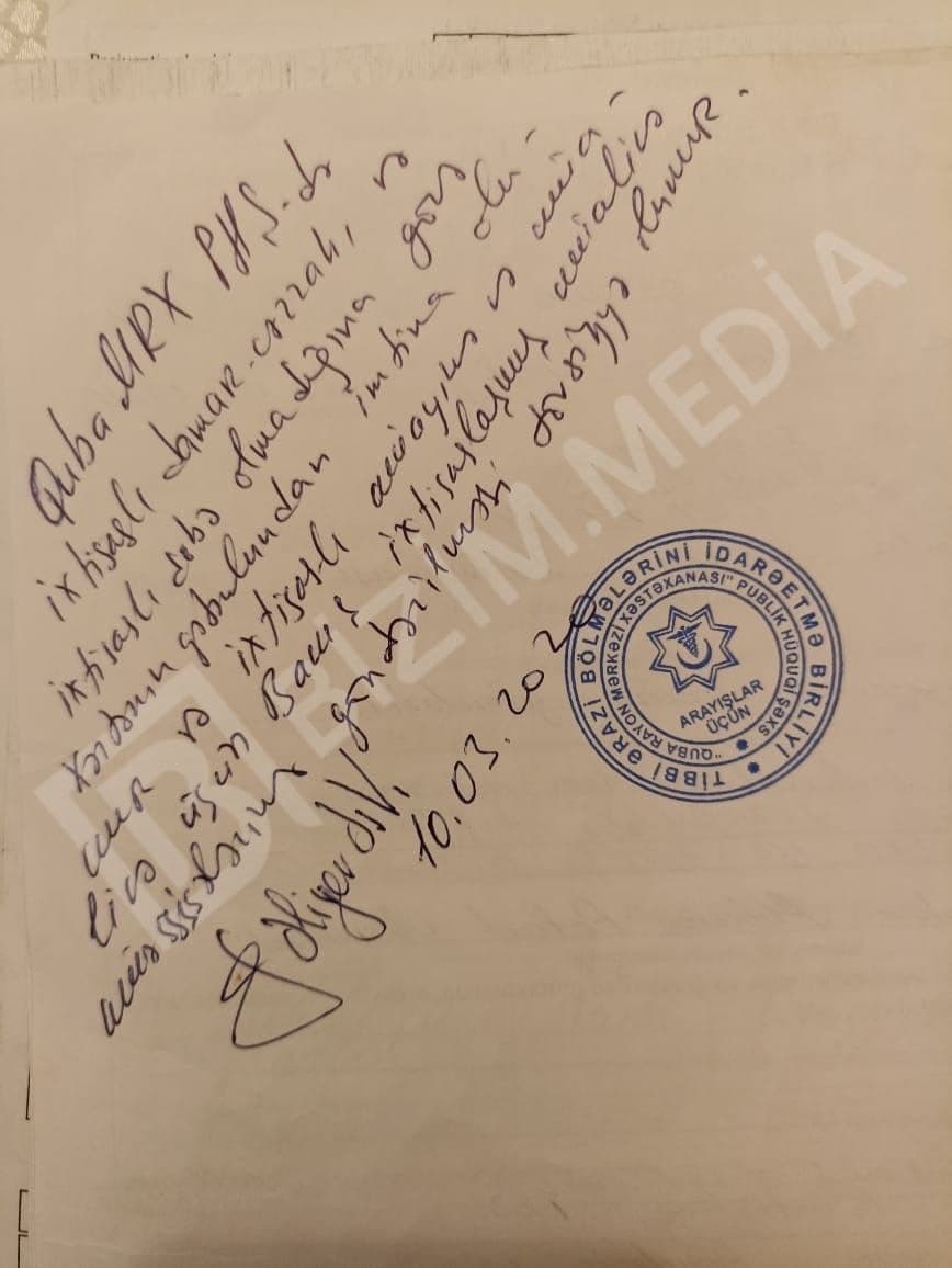 “Orada o xanıma stasionar kağız deyil, ancaq müayinə haqqında arayış veriblər. Həkim Məsləhəti Komitəsinə etdiyimiz müraciətə cavab olaraq stasionar müalicə müddəti az olduğu üçün əlavə müalicə təyin edilib. Qanunla xəstə əlilliyinin olub-omaması üçün əvvəl stasionar müalicə olunmalıdır. Bu müalicədə sonra onda əmək qabiliyyətinin həqiqətən pozulması təsdiq olunsa biz nəticələrini aidiyyatı qurumlar üzrə yollayırıq. Bundan sonra Xaçmaz Həkim Məsləhət Komitəsi məsələyə baxıb, qərar verirlər. Əgər xəstənin əmək qabiliyyəti həqiqətən pozulubsa, onun sənədləri Sosial Müdafiə Nazirliyinin Tibbi Sosial Ekspertiza komitəsinə göndərilir. Vətəndaşın hara müraciət etməsindən asılı olmayaraq, qanun olaraq hər bir xəstə bu prosedurdan keçməlidir”.