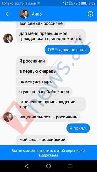 7NEWS.az xəbər verir ki, bu barədə redaksiyamızın elektron poçt ünvanına daxil olan fotofaktda hər şey aydın qeyd olunub. Rusiya Azərbaycanlıları İttifaqının mətbuat xidmətinin rəhbəri Anar Həsənovun yazışmasından da hiss olunur ki, ölkəmizə qarşı ciddi qəzəbi və kini var. Yazışmanın tərcüməsini təqdim edirik:
