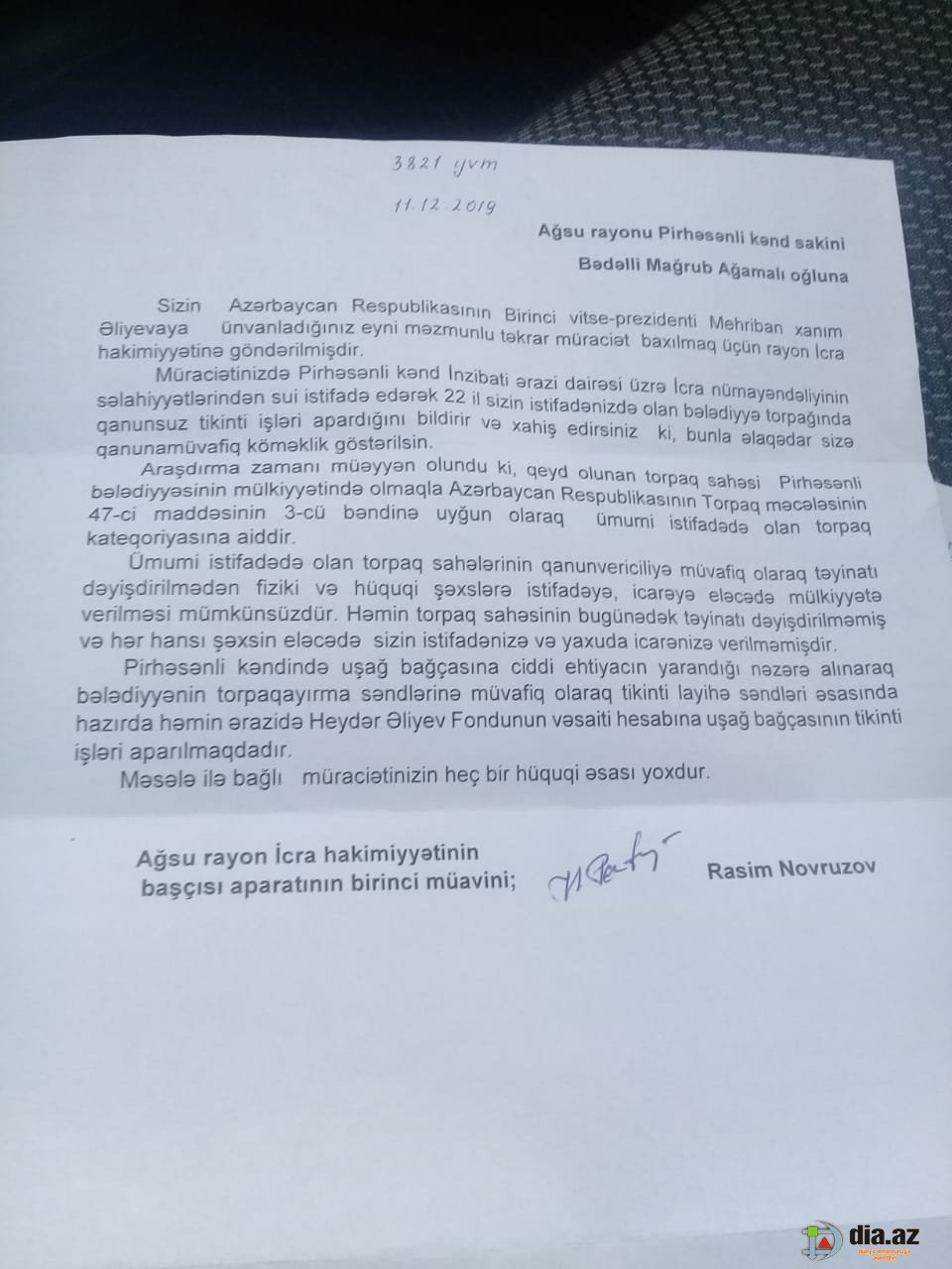 Bir neçə gün öncə Ağsu rayonu , Pirhəsənli kənd sakinin ünvanına Ağsu RİH -in ay yarım əvvəl - noyabrda işdən çıxarılan birinci müavini Rasim Novruzovun dekabrda imzaladığı 11.12.2019 tarixli məktubu daxil olub . Elə bir neçə gündür ki , bu analoqsuz özbaşınalıqdan baş açmaq olmur . Bəyəm Ağsu RİH başçısı məktub imzalamaqdan belə çəkinir ki , işdən çıxardığı müavinin imzası ilə vətəndaşlara cavab verir ? Ya şablon cavabları əvvəlcədən imzaladıb əlinin altında hazır saxlayır ?