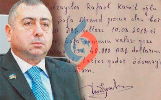 Xatırladaq ki, bir neçə ay əvvəl Rafael Cəbrayılovun deputat vəsiqəsini girov qoyaraq 2015-ci ildə Fətəliyeva Təranə Rasim qızından 300 min ABŞ dolları məbləğində borc aldığı məlum olmuşdu. Borcun qaytarılmadığını görən Təranə Fətəliyeva Abşeron Rayon Məhkəməsinə müraciət etmişdi.