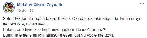Daha sonra vətəndaş narazılığı belə ifadə olunur: "Pulunu ödədiyimiz xidməti niyə göstərmirsiniz, "Azəriqaz"? Bunların əməllərini ictimailəşdirməsən, dünya veclərinə deyil.