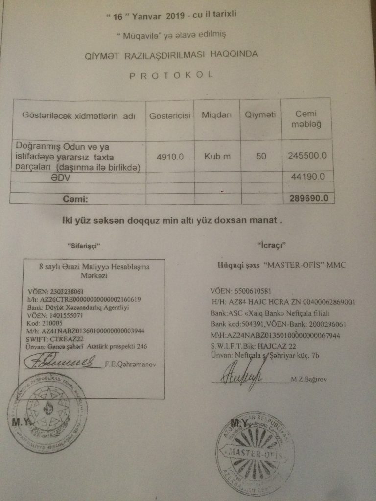 Adı çəkilən maliyyə hesablaşma mərkəzi “Doğranmış odun və ya istifadəyə yararsız taxta parçaları”na iki il ərzində əgər Neftçala rayon, Xalq Bank filialına 588 min, 690 manat pul ayırıbsa, həmin rayonun Ekalogiya baxımında ərazilərinə baxış keçirilsə, kəsilmiş ağacların, istifadəyə yararsız olan odunların və taxta parçalarının, hansı istiqmətdə əldə etməkləri hüquq mühafizə orqanları çox asant əldə etməklə araşdıraraq ictimaiyyətə açıqlama verilər. Əlavə olaraq bildirək ki, hər bir ağacın kəsilməsi üçün akt tədbiq olunur, əgər o ağac yararsızdırsa Ekologiya Nzirliyinin əməkdaşlarının,hüquq mühafizə orqanlarının baxışı nəticəsində kəsilir. Bir də ki, iki il ərzində çox kiçik rayonda yarım miliyondan çox olaraq ağacın kəsilməsi, vəyaxud yarasız ağacın olması absuddur.
