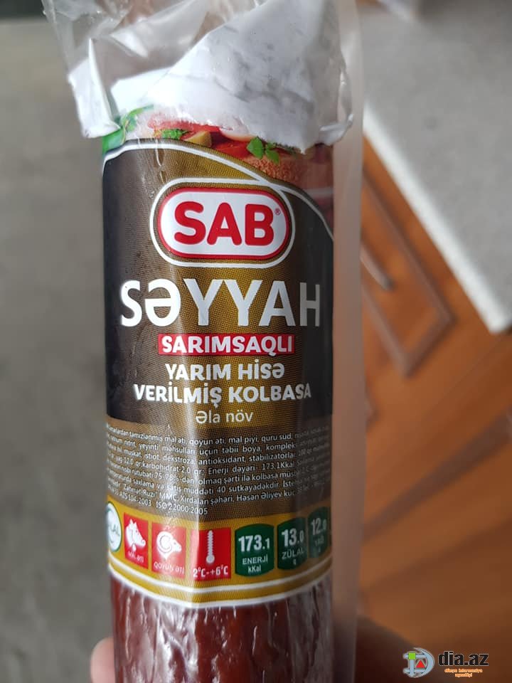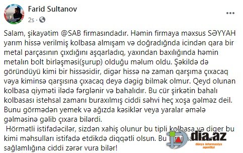 DİA.AZ: - "Şikayətim "SAB" firmasındadır. Həmin firmaya məxsus "Səyyah" yarım hissə verilmiş kolbasa almışam və doğradığnda içindən qara bir metal parçasının çıxdığını aşkarladıq". DİA.AZ bildirir ki, bunu Bakı sakini Fərid Sultanov sosial şəbəkədə paylaşıb.