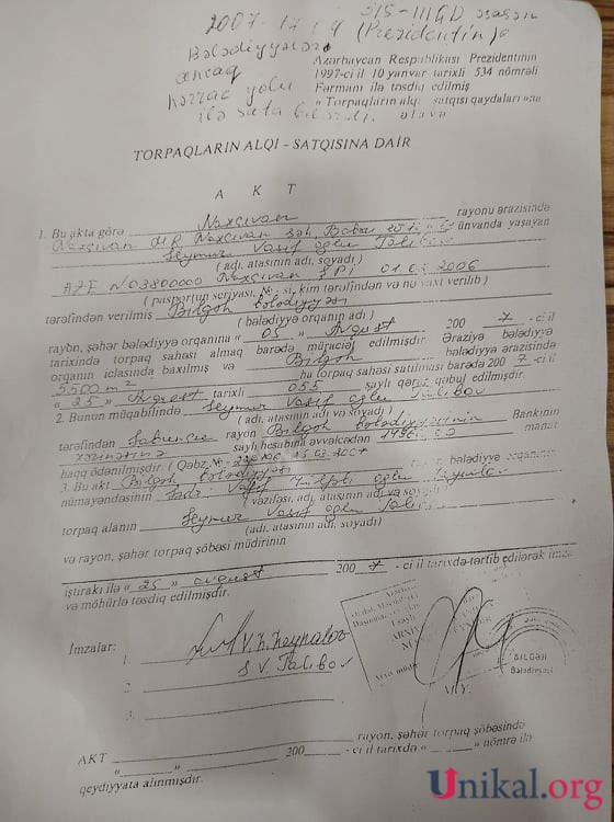 Qeyd edək ki, Azərbaycan Respublikası Prezidentinin 17.04.2007-cil il tarixli Fərmanı ilə bələdiyyələrə ancaq hərrac yolu ilə öz ərazisində qeydiyyatda olan şəxslərə öz torpaqlarını satmağa icazə verilir. Alqı-satqı sənədlərindən görünür ki, Seymur və Bahar Talıbovlar Naxçıvan şəhər qeydiyyatındadılar. Həmçinin onu da xatırladaq ki, qanunvericilik ancaq 6 və ya 12 sot torpağın vətəndaşlara satılmasına imkan verir.
