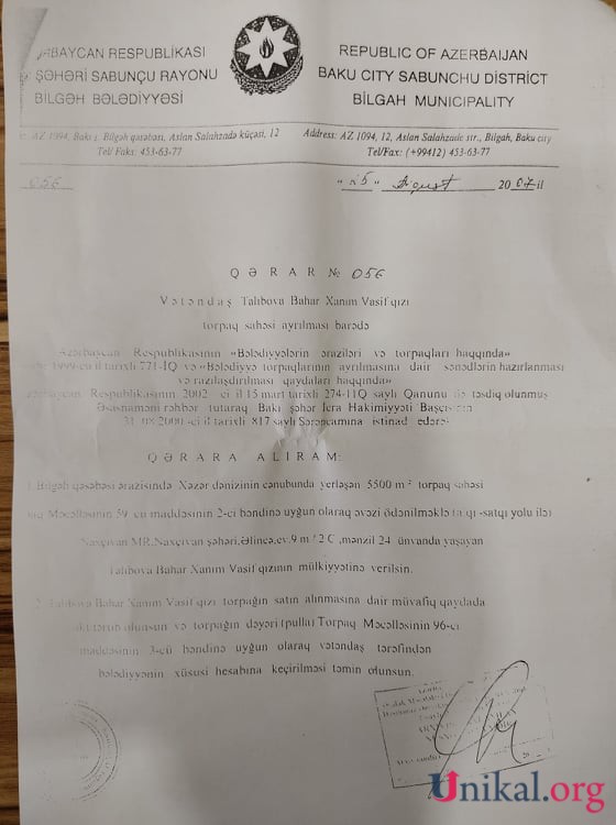 Belə ki, torpağı Sabunçu rayonu, Bilgəh qəsəbə bələdiyyəsi tərəfindən zəbt olunan Hacıyeva Sevil İsfəndiyar qızının hüquqlarını müdafiə edən hüququşünas Nicat Gözəlov Unikal.org-un redaksiyasına kifayət qədər sübutlarla dolu olan məhkəmə sənədləri təqdim edib.