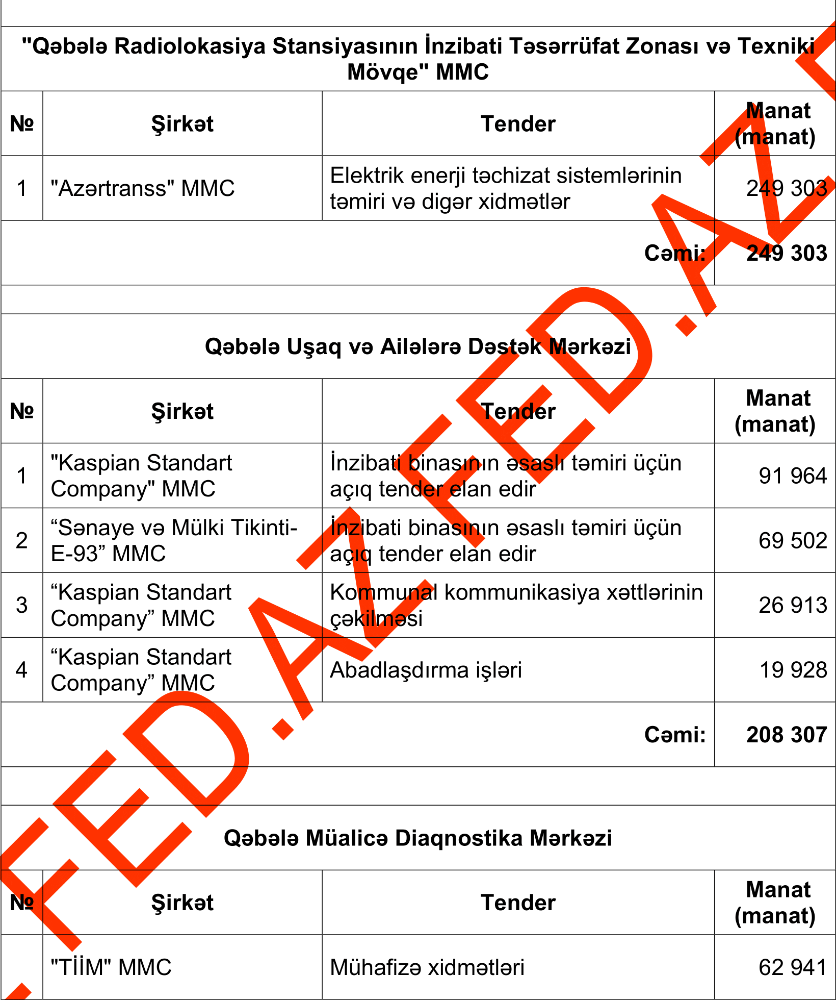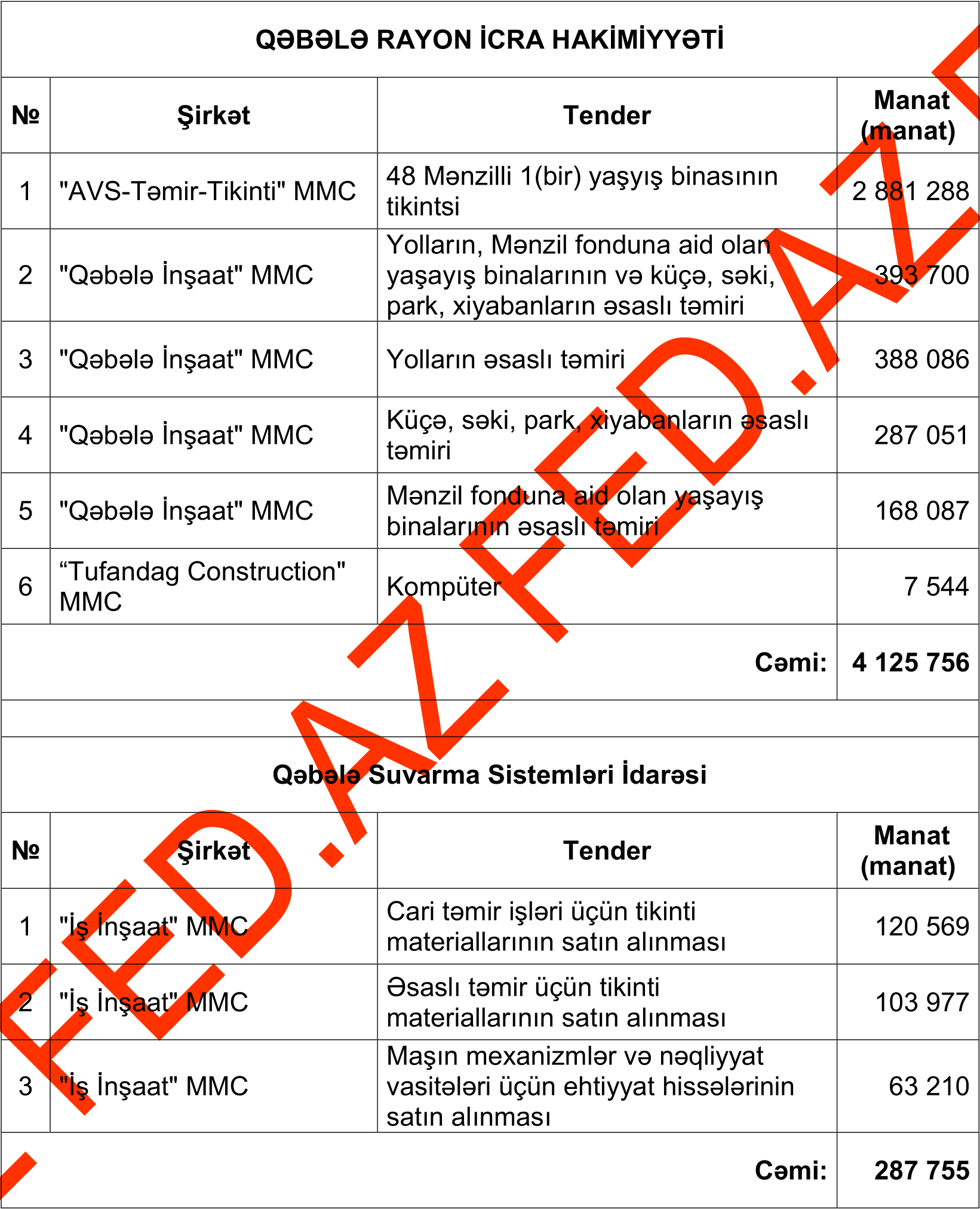 "AVS-Təmir-Tikinti" MMC və "Qəbələ İnşaat" MMC-nin qazandığı 5 tenderin məbləğinin cəmi rayonda keçirilən bütün tenderlərin məbləğinin cəminin 79%-ni təşkil edir.
