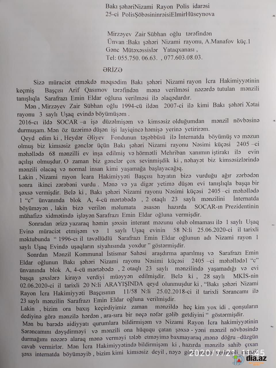 Uşaq evinin məzunu, 1990-cı il təvəllüdlü Zair Aslan oğlu Mirzəyev dövlət tərəfindən ona verilməli olan evin Nizami Rayon İcra Hakimiyyətinin keçmiş başçısı Arif Qasımov tərəfindən başqasına satıldığını iddia edib. DİA.AZ-ın məlumatına görə, Z.Mirzəyev bildirib ki, Xətai rayonunda yerləşən 3 saylı uşaq evindən məzun olub. Belə ki, 1993-cü ildən 2007-ci ilədək uşaq evində yaşayıb. Hazırda isə Dövlət Neft Şirkətinin Nizami rayonunda yerləşən yataqxanasında məskunlaşıb. “Uşaq evinin məzunu kimi mənzillə təmin olunmağım üçün Əmək və Əhalinin Sosial Müdafiə Nazirliyinə, Nizami Rayon İcra Hakimiyyətinə dəfələrlə müraciət etmişəm. Lakin müraciətlərim nəticəsiz qalıb”.