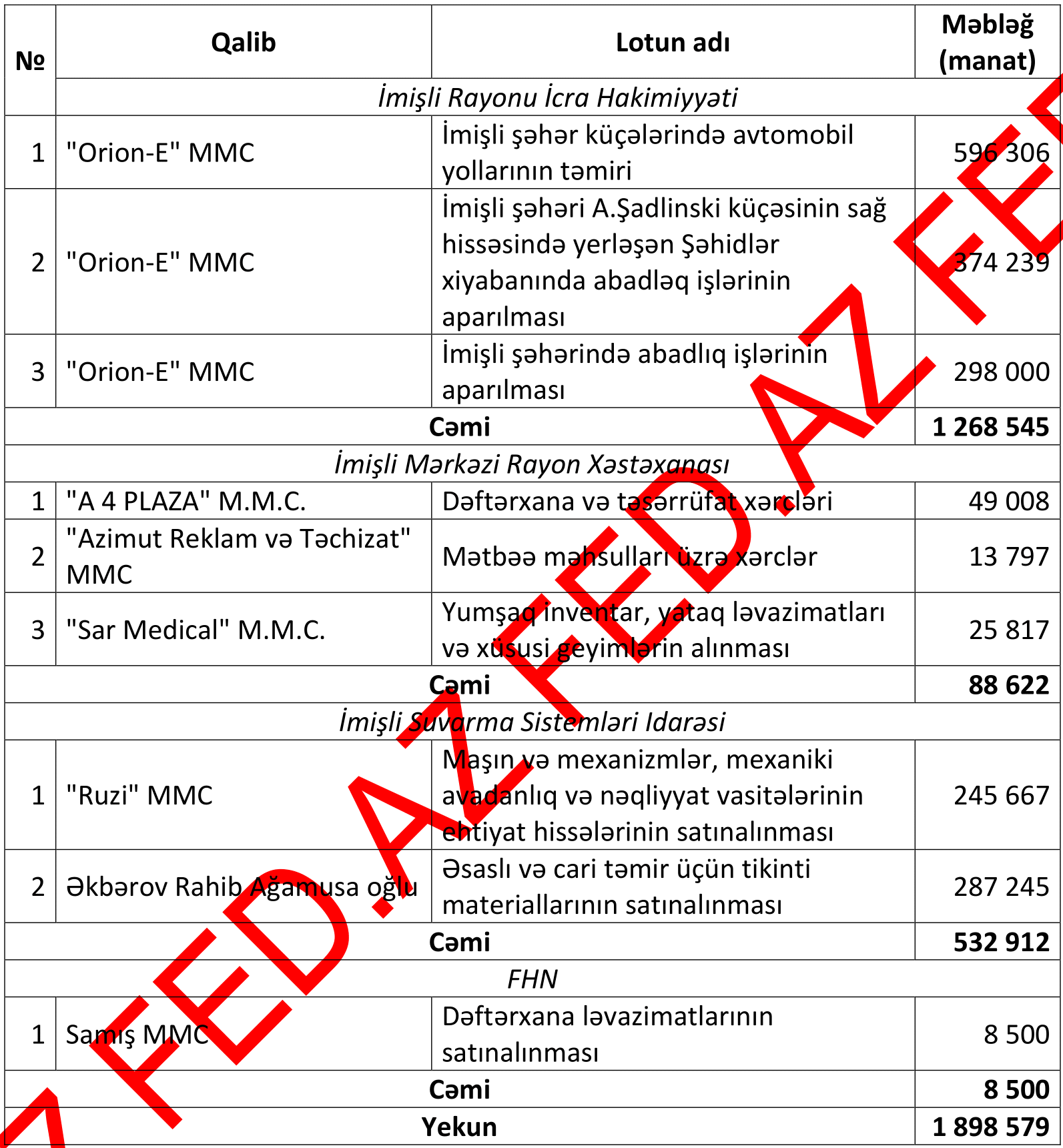 diaaz.space-ın məlumatına görə, İcra hakimiyyəti 3 tenderə 1 milyon 268 min 545 manat xərcləyib. İmişli Rayonun İcra Hakimiyyətinin keçirdiyi hər 3 tenderin qalibi "Orion-E" MMC olmuşdur.