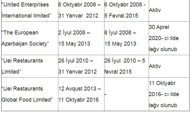 Fövqəladə Hallar naziri Kəmaləddin Heydərovun oğlanları Tale və Nicat Heydərovlar tərəfindən 2011-ci ildə Böyük Britaniyanın paytaxtı Londonda təsis olunan “Cafe Baku Limited” və "Azerbaijan Juices Limited” şirkətləri ləğv olunur.
